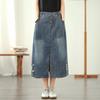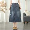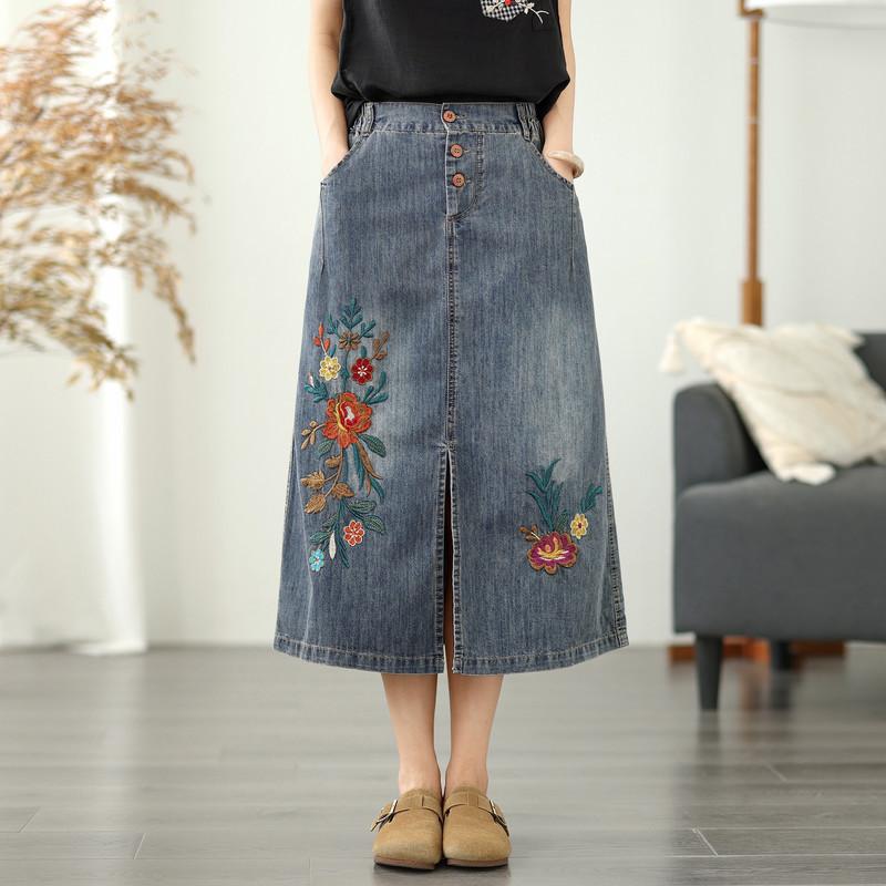 Summer Embroidered Flower Semi-elastic Waist Button Denim Skirt