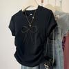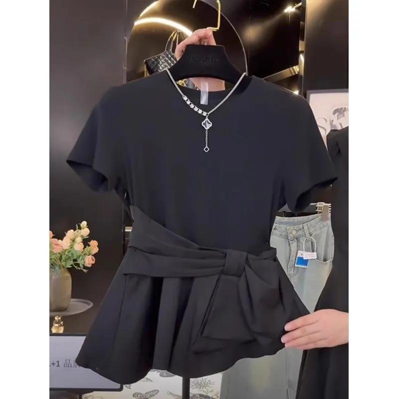 Women's Summer Asymmetric Shoulder Short-Sleeve T-Shirt Slimming Waist-Defining Bow-Detail Patchwork Top