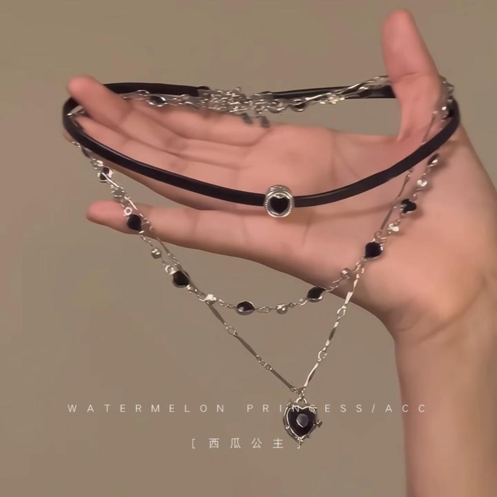 "Black Rope Sweet Heart" Multi-layered necklace Spice Girl Sweet Cool Black Rope Chain Collarbone Chain Neck Chain