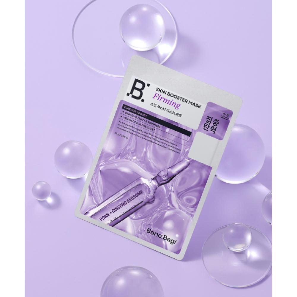 BANOBAGI Skin Booster Mask Firming (5 sheets) is a sheet mask designed for improving skin elasticity. This product comes in a capacity of 25g with 5 sheets, suitable for all skin types. It contains dual exosomes made from PDRN and ginseng that help enhance skin elasticity, moisturization, and texture improvement. The mask provides a cooling sensation, adheres easily, and absorbs smoothly without any irritation on the skin.