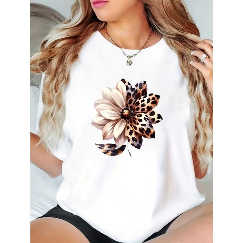European Size Women's Plus Size White Leopard & Flower Print T-Shirt - Short Sleeve Round Neck Blouse-Compatible Suitable for Daily Wear