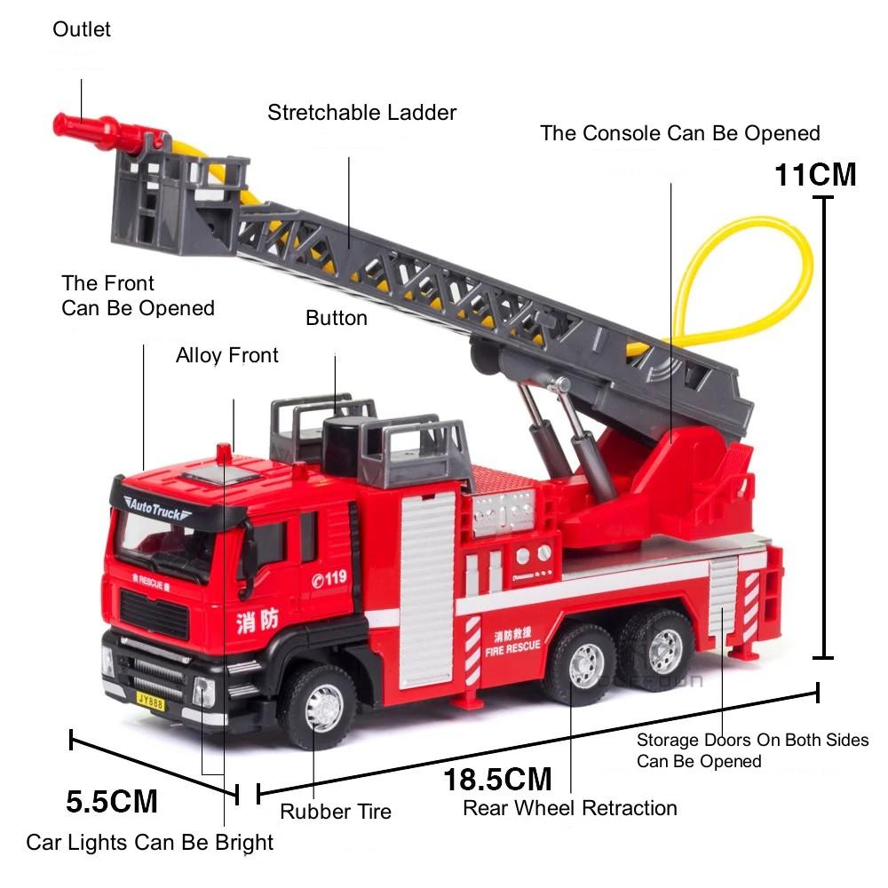 1/50 Alloy Diecast Car Model Toy Fire Engine Metal Vehicle Body Simulated Water Spray Light Sound With Pull Back Children's Toys