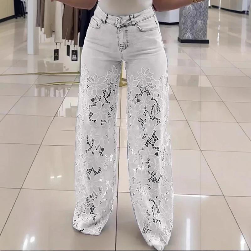 Casual Crochet Spliced High Waist Trousers Ladies Sexy Lace Hollowed Out Jeans Summer Retro Solid Color Wide Leg Pant
