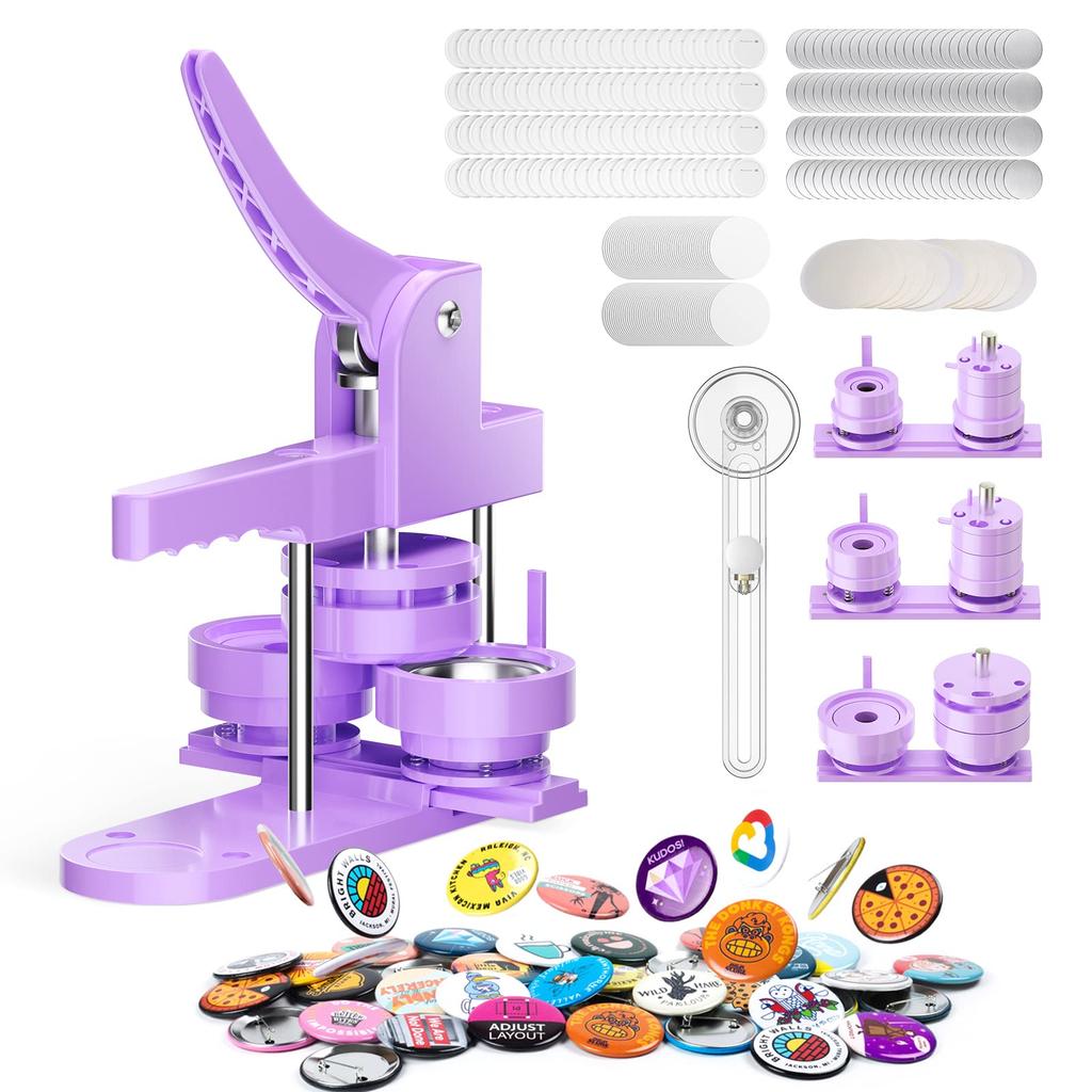 DIY Badge Machine with Interchangeable Bases Includes 300 Metal Badge Perfect for DIY Handmade Kits (25mm, 32mm, 58mm), Materials, Crafts, (Purple)