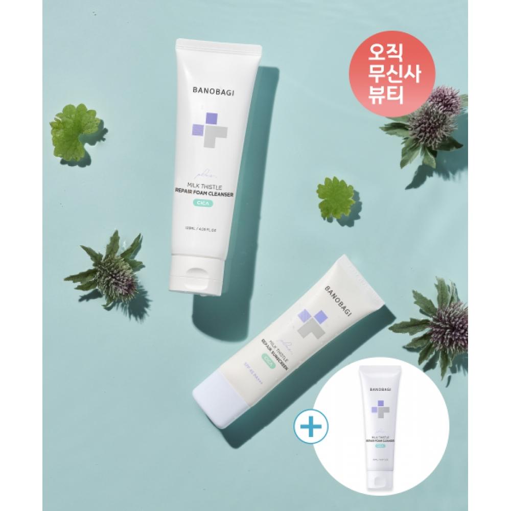 BANOBAGI Milk Thistle Repair Cica 2-Piece Set includes 50ml of sunscreen, 120ml of foam cleanser, and a 120ml Cica foam, suitable for all skin types and designed for sensitive skin with low irritation. The high concentration of milk thistle ingredients helps to soothe and heal the skin. The overall effect of this product minimizes skin irritation while providing hydration to maintain healthy skin.