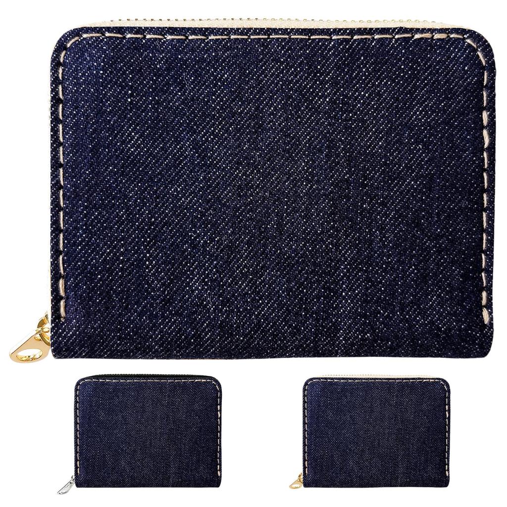 Trendy Yamagishi Denim and Leather Bellows Simple Bifold Wallet for Men and Women, Card Slots, Bill Compartment, Round Zipper, Kojima Denim, Gold