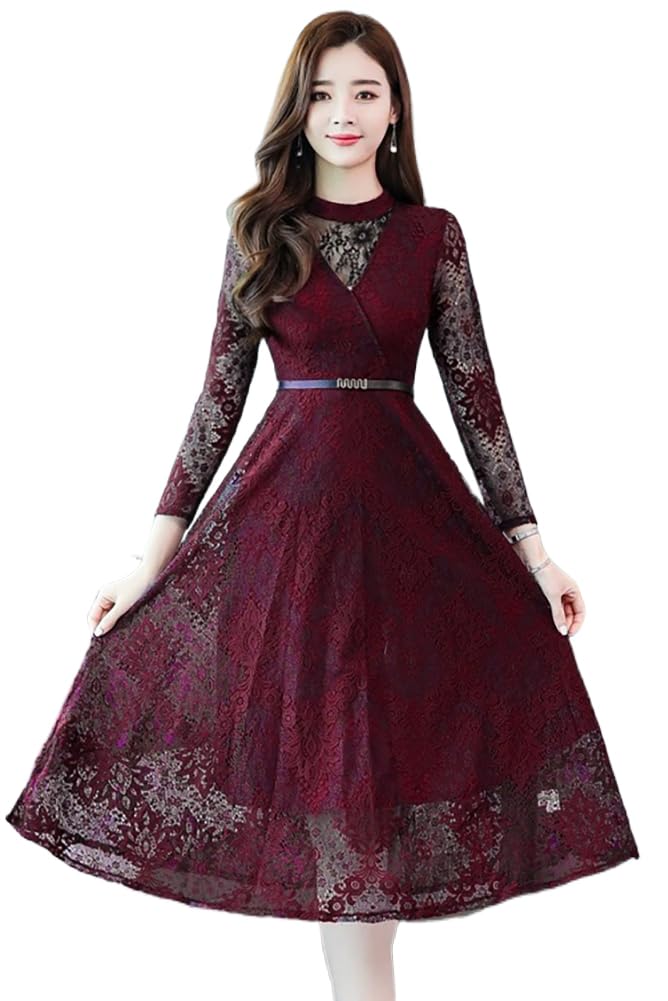 This women's long-sleeved lace dress is made of a firm, comfortable lace material, giving it a soft feel, and the body is lined to prevent it from being see-through.