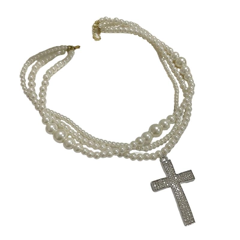 Retro Crystal Crosses Pendant Necklace Featuring Multilayer Faux Pearls Clavicle Chain For Elegant Jewelry Collection