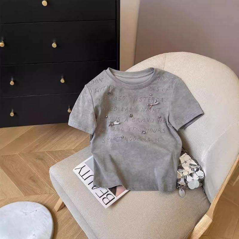 Chic Short-sleeved T-shirt for Women Summer New Style Right-shoulder Slim-fitting High-end Round Neck Right-shoulder Top
