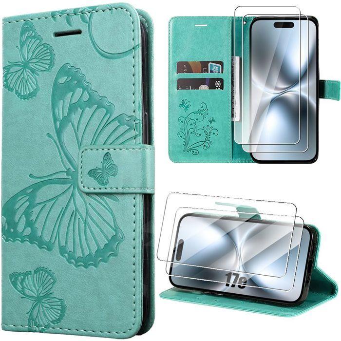 Coque Synthécuir - BOOLING - pour iPhone 17e - Antichoc Motif Papillon - Vert - 2 Verres Trempés