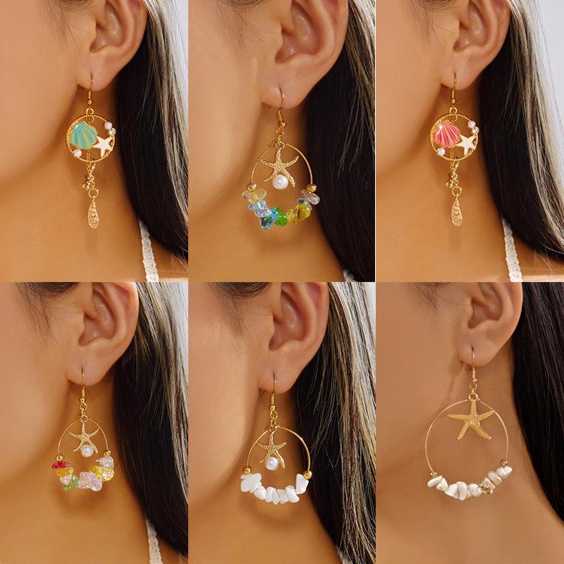 Asymmetrical starfish shell colorful gravel large circle earrings, summer dopamine sweet vacation wind beach earrings