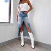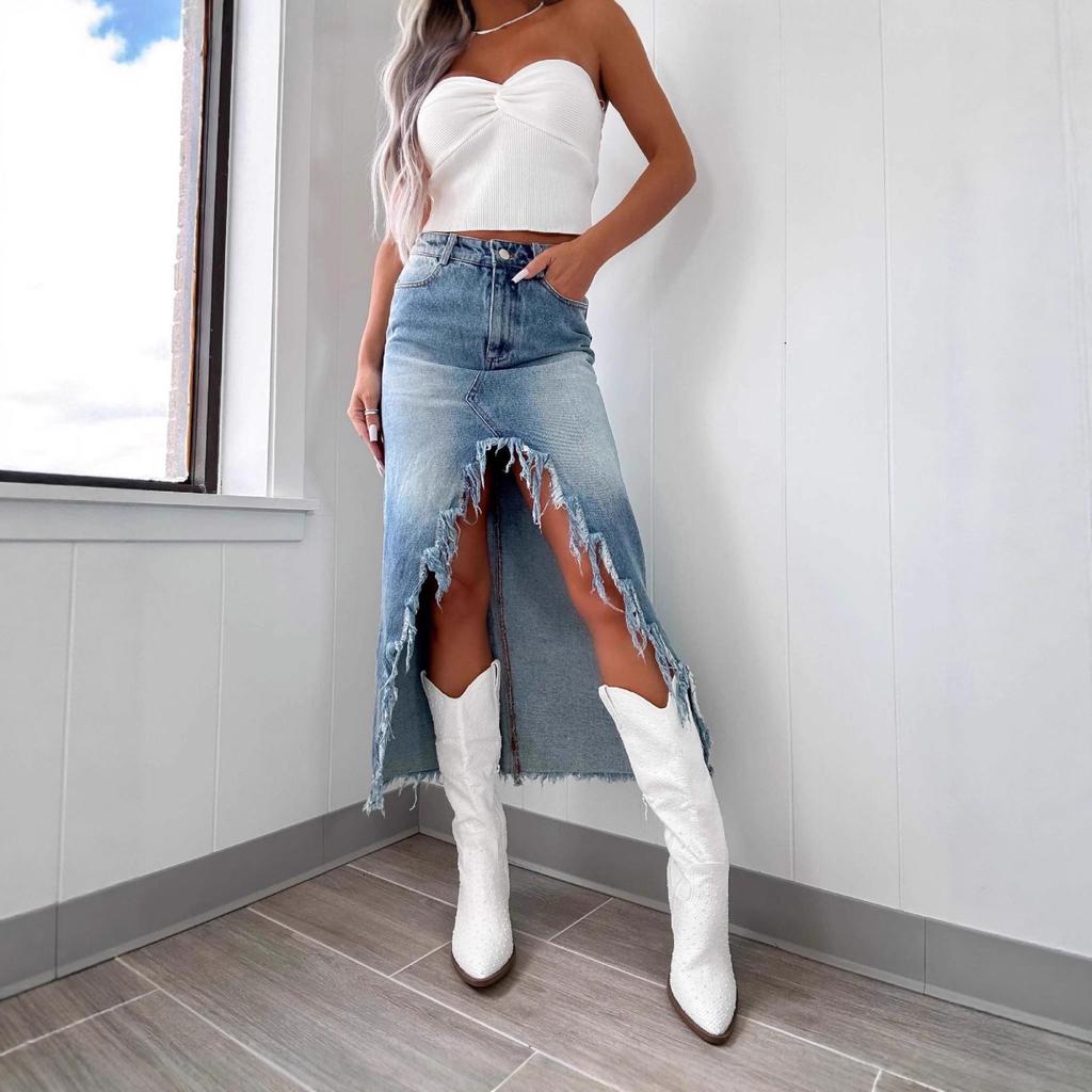 This stylish midi skirt from the Spring 2025 Collection is crafted from premium denim, offering a vintage washed look with a modern twist. Its high-waisted design is accentuated by an irregular frayed hem, adding a touch of edgy charm to its classic solid pattern. Perfect for versatile styling, this skirt effortlessly combines comfort with contemporary fashion, making it an essential addition to your wardrobe.