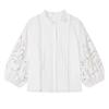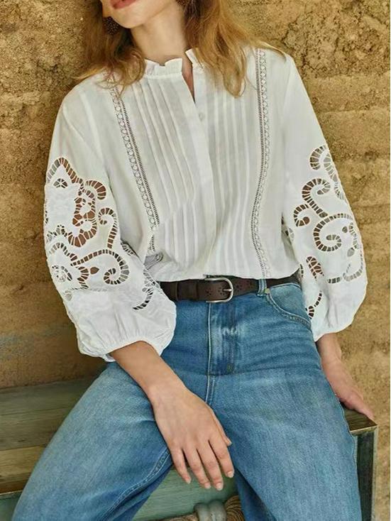 This elegant blouse combines timeless style with modern sophistication, crafted from high-quality cotton that offers both comfort and durability. Its solid pattern creates a clean and versatile look, while the long sleeves add a touch of formality suitable for various occasions. The blouse is beautifully adorned with delicate lace embroidery, enhancing its elegance and providing a subtle, feminine charm perfect for any spring event.