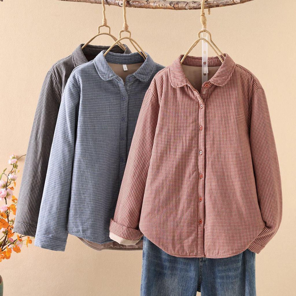 Women's Quilted Plaid Long-Sleeve Cotton Shirt with Doll Collar - Fall/Winter Collection