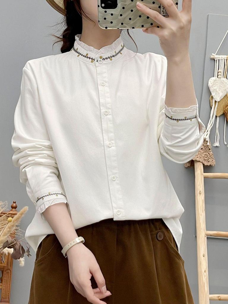 Korean Elegant Embroidered Lace Collar Flannel Shirt for Women - Warm Autumn/Winter Base Layer