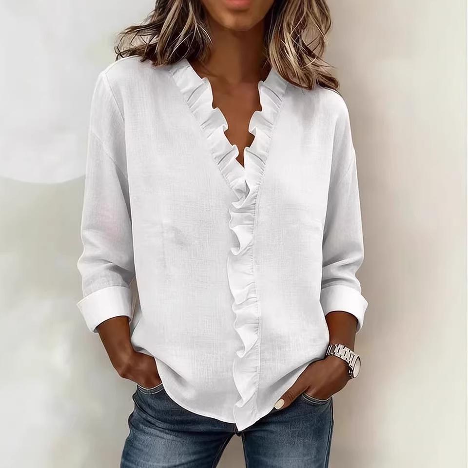 Experience a blend of elegance and comfort with this women's long-sleeve shirt, perfect for the European Spring of 2026. Crafted from high-quality polyester fabric, this top features delightful ruffle trims that add a touch of femininity to its solid pattern. Designed with long sleeves, it offers both style and warmth, making it an ideal choice for those cooler spring days.