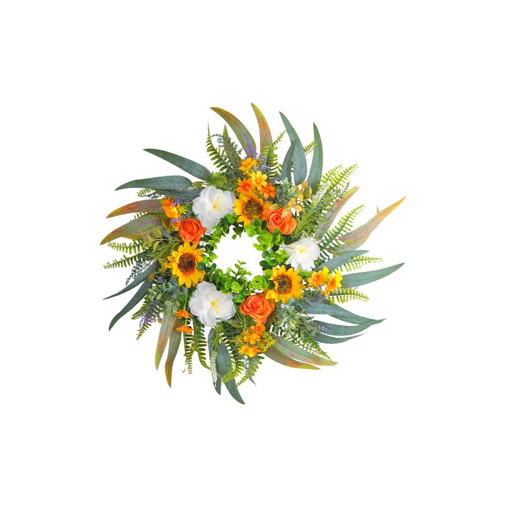 Summer Garden Inspiration: This 55cm wreath cleverly blends the fresh green of leaves, the energy of sunflowers, and the gentle elegance of roses, adorned with various small flowers to present a full and summer feel.