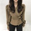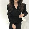 Embrace effortless style this autumn and winter with this sophisticated top designed for women. Crafted from a polyester-spandex blend, it offers a comfortable and flexible fit. The top features a flattering V-neckline and short sleeves, making it perfect for layering or wearing alone. The unique suit collar adds elegance, while the waist-cinching tie-up detail creates a beautiful silhouette, ensuring you stay chic and stylish in any European setting.