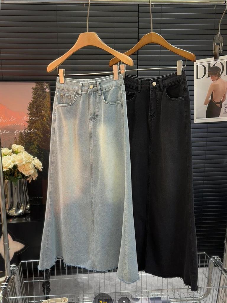 Women's Slim Fit Frayed Denim A-Line Skirt - Retro Fishtail, Mid-Length (Spring/Summer 2024)