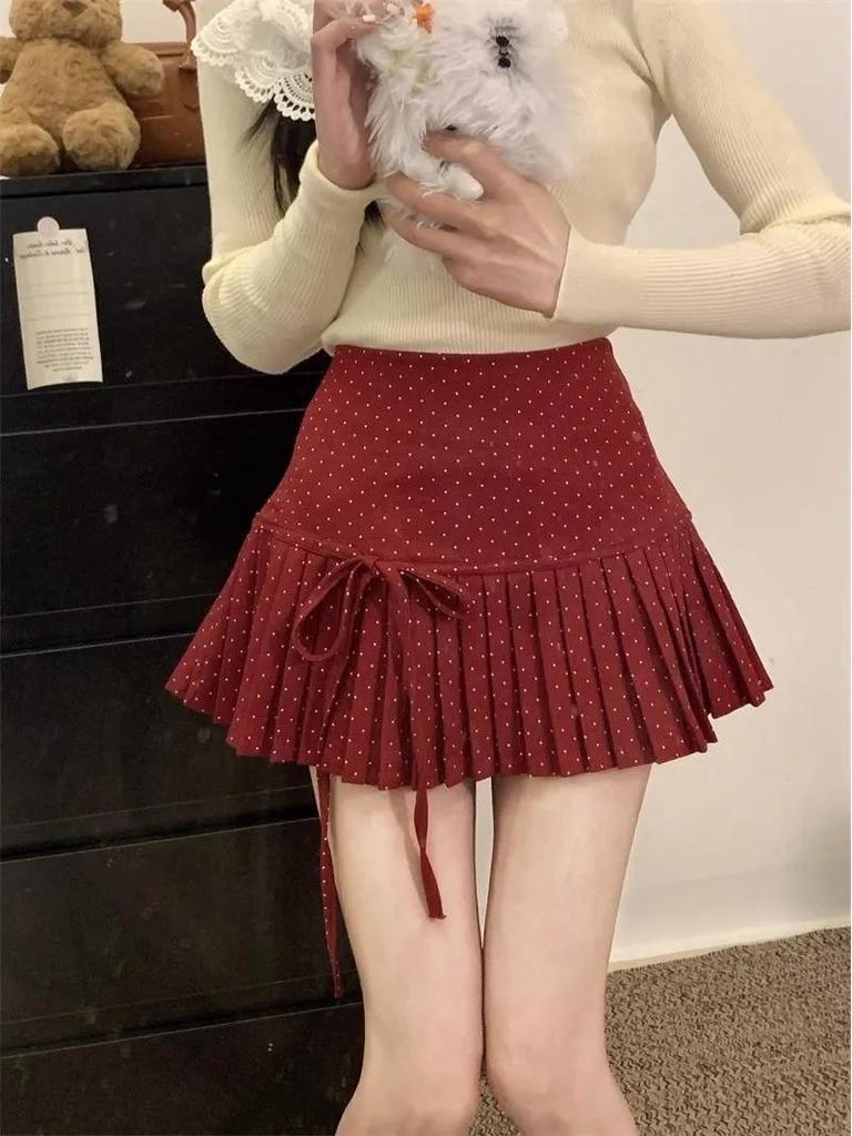 Polka Dot Bow Tie Pleated Mini Skirt with Lace-Up - A-Line, Anti-Exposure, Girlish Summer Design
