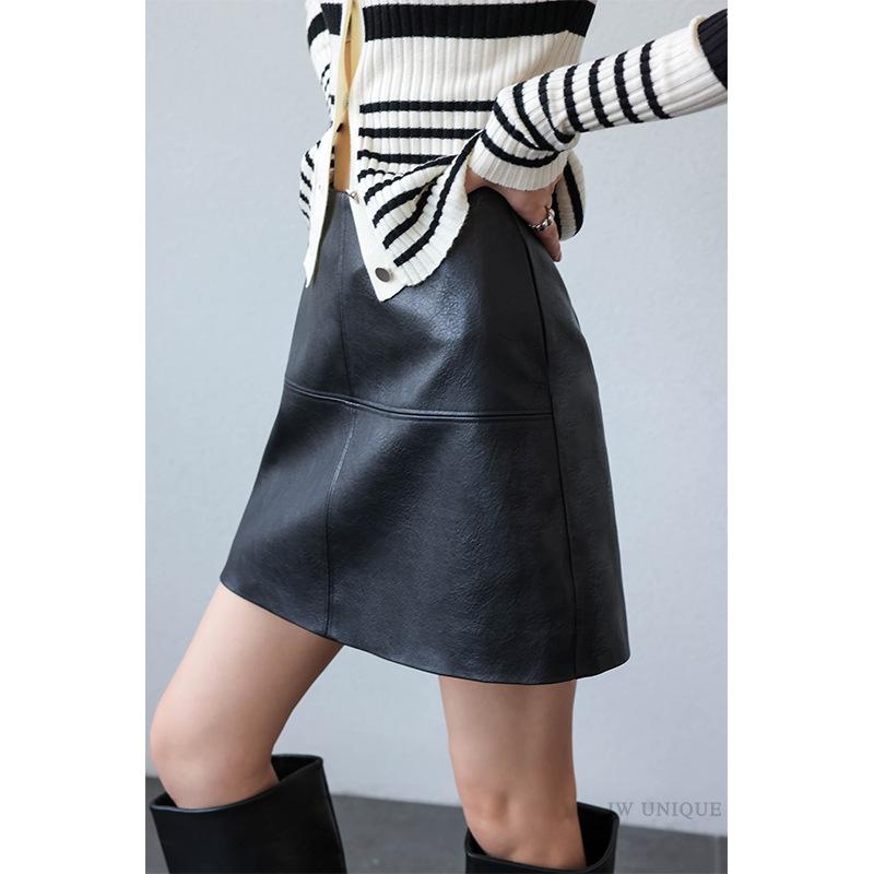 JWUNIQUE Women's Dimple Black High-Waisted A-Line Leather Mini Skirt for Slimming Fit - 2025 Autumn Collection