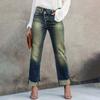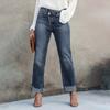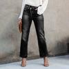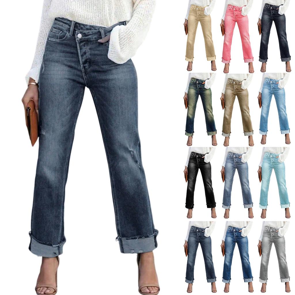 Ladies' Color Casual Versatile Mid Waist Straight Leg Denim Straight Leg Jeans With Fringed Edges