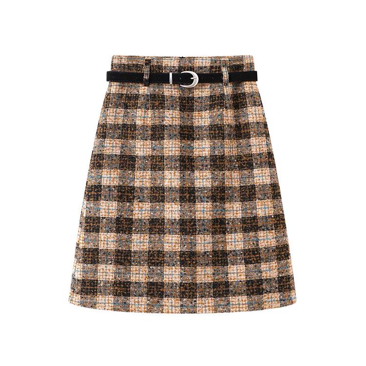 Feiyuan Women's Retro Plaid Wool Midi Skirt with Belt - Stylish Korean Pencil Skirt for Early Spring