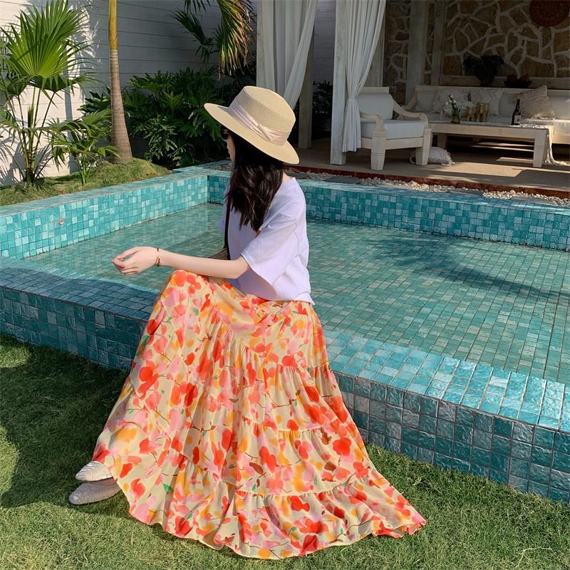 Feiyuan Bohemian Pastoral Chiffon Midi Skirt, One Size, A-line Swing Design for Vacation Style