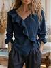 Women's Solid Color V-Neck Long Sleeve Casual Ruffle Cotton Linen Top 2026