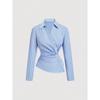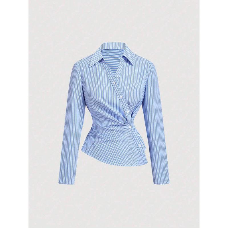 European Asymmetrical Twist Knot Blue & White Striped Long-Sleeve Women's Shirt