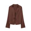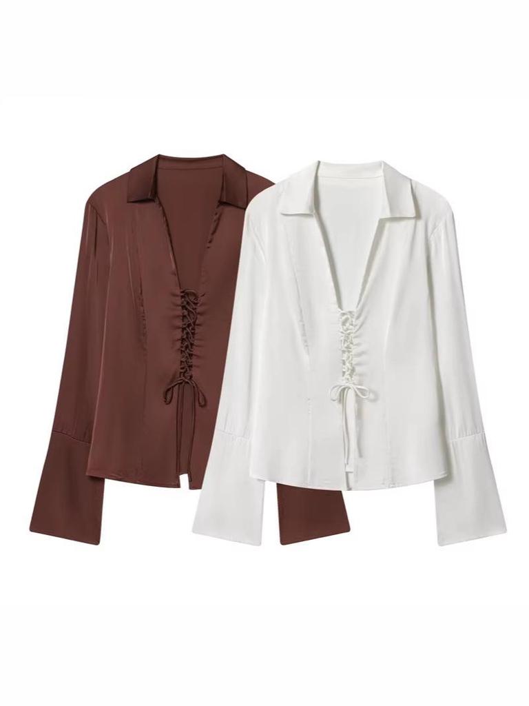 Kadınlar İçin Zarif Vintage Saten V Yaka Bağcıklı Uzun Kollu Üst