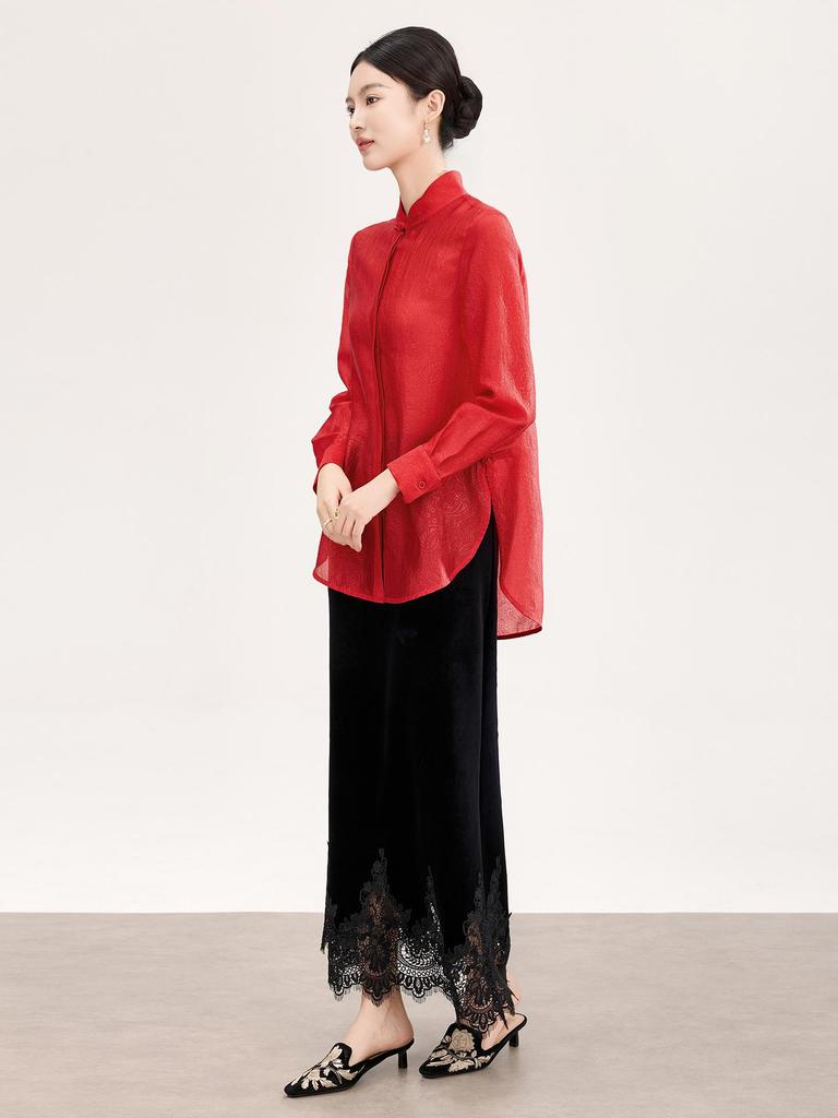 Elevate your spring wardrobe with this exquisite women's silk jacquard shirt, perfect for a touch of elegance at any tea ceremony. Crafted from luxurious viscose materials with an intricately woven rayon jacquard finish, this top boasts a sophisticated solid pattern. The long sleeves and stand neckline enhance its classic Chinese-inspired design, while frog button detailing adds a whimsical touch. Ideal for those who appreciate refined style and comfort, this shirt offers a blend of timeless tradition and modern chic.