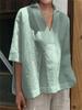 This stylish women's shirt is the perfect addition to your 2026 spring and summer wardrobe. Crafted from a luxurious blend of cotton and linen, it offers both comfort and breathability. The shirt features a flattering V-neck with a tailored neckline, complemented by long, loose-fitting mid-sleeves that ensure a relaxed fit. Its solid pattern provides versatility, making it easy to pair with various outfits. Unique patchwork and quilted decorations add a touch of sophistication and texture, making this piece stand out. Whether you're dressing up or keeping it casual, this shirt is a chic and effortless choice.