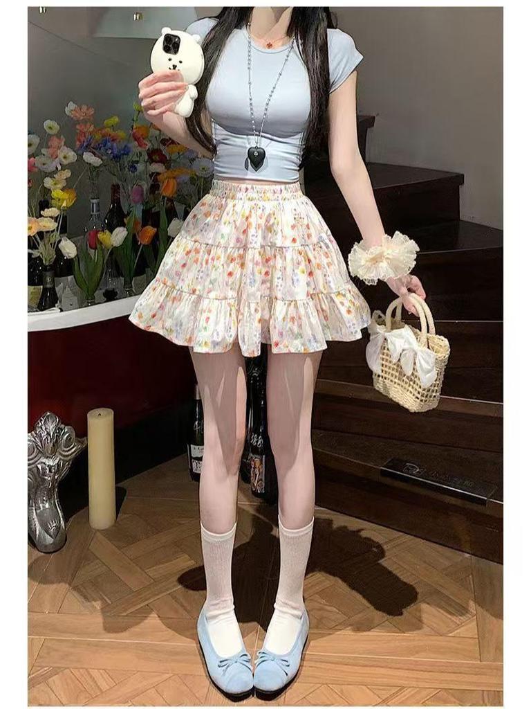 Women's Floral Print A-Line Mini Skirt - Summer High Waist, Slimming Korean Style, Sweet Pleated, Petite Layered Cake Design