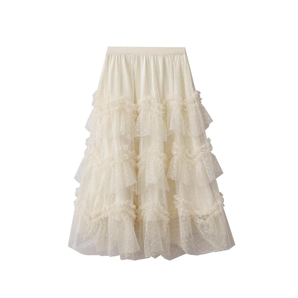 Irregular Wood Ear Lace Polka Dot Mesh Skirt – Women's Autumn/Winter French Style Fluffy Long Cake Skirt
