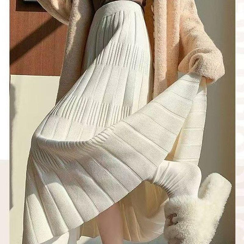Autumn & Winter High-Waisted Knitted Pleated Long Wool Skirt for Women