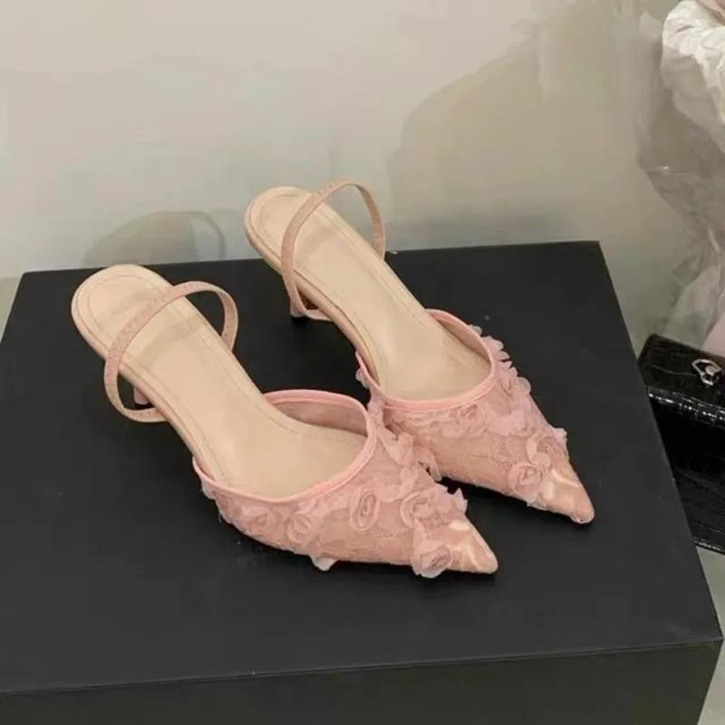 White Women Wedding Pumps Mesh Embroidered Flowers Back Strap Sexy Slingback High Heel Dress Shoes for Ladies