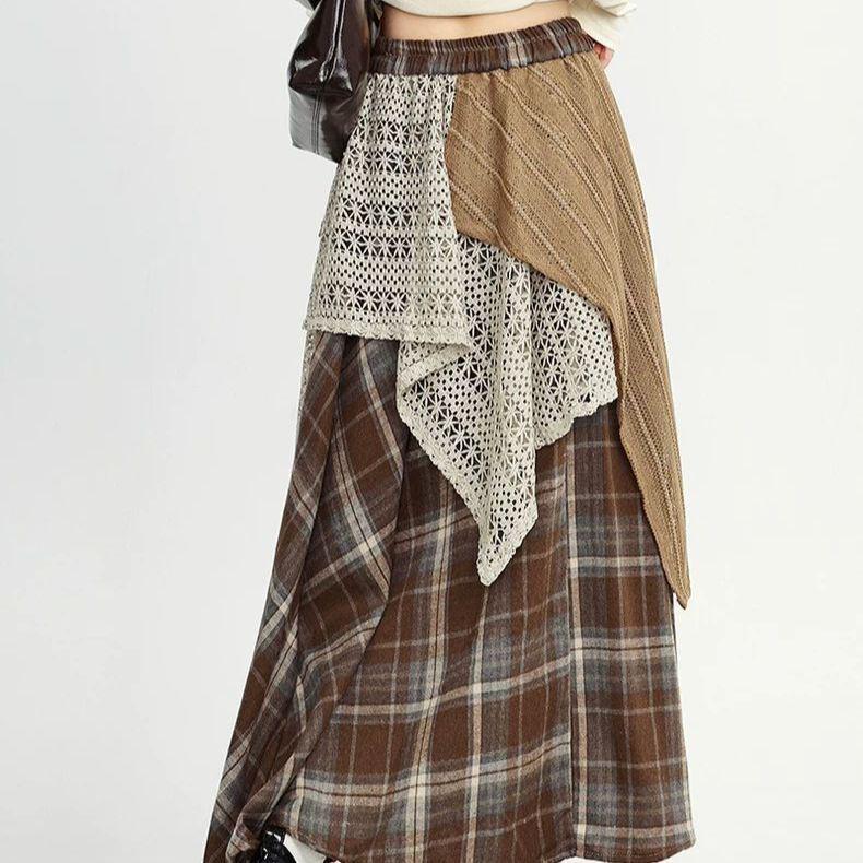 Retro High Waist Plaid Swing Skirt with Irregular Letter Patchwork in Red