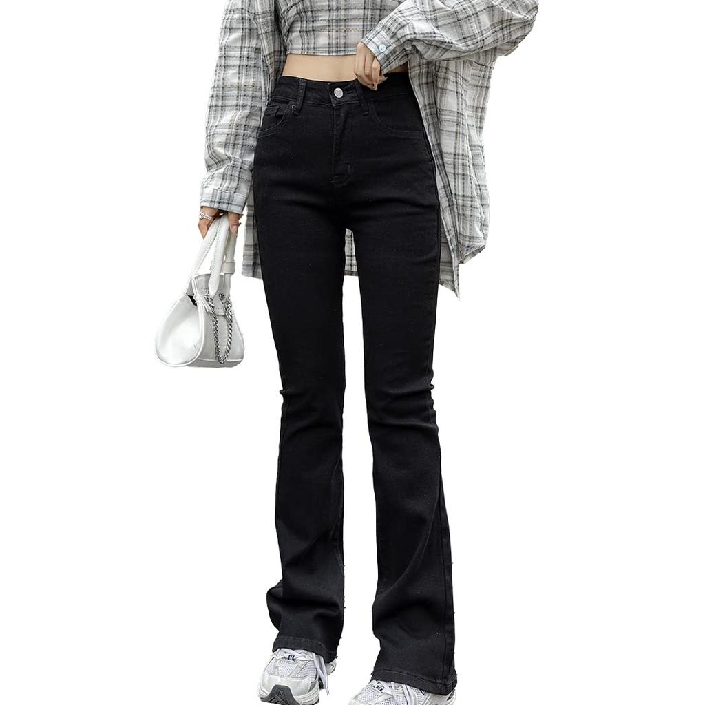 Teddy Streetwear Flare Denim Pants 459 Women's Jeans, Stretch, Lightweight, High-Waisted, Spring, Summer, Fall, (L, Black)
