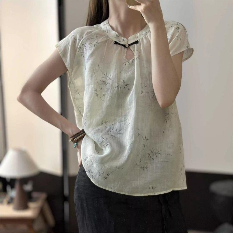 Semi-free Summer New Style Literary and Zen Style Bamboo Leaf Printed Cotton and Linen Chinese Style Loose-fitting Top for Women