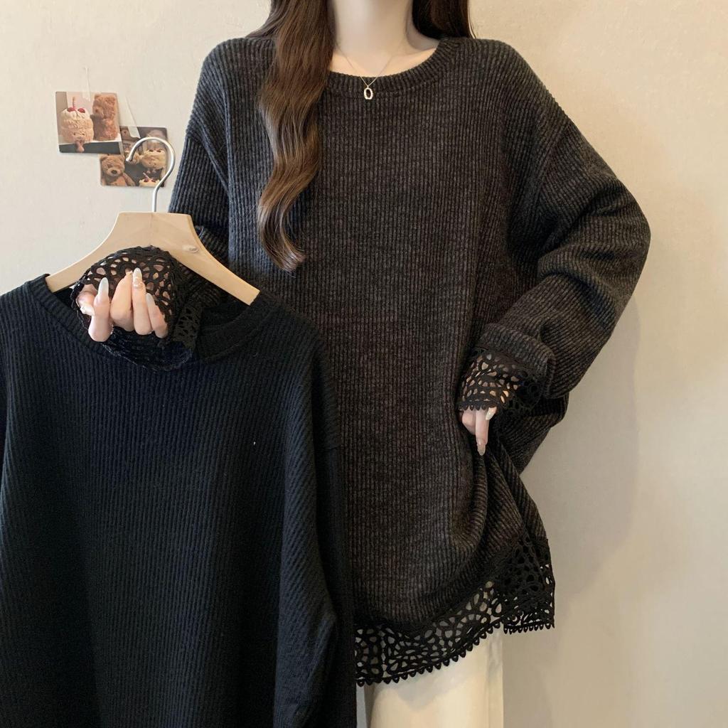 Plus Size Velvet Lace Patchwork Long Sleeve T-shirt for Autumn/Winter - Loose Fit, Flaw-Concealing, Slimming Design