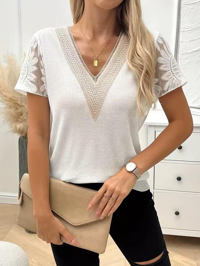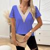 European-American Women's Casual V-Neck Short-Sleeved Lace Patchwork Henley Top