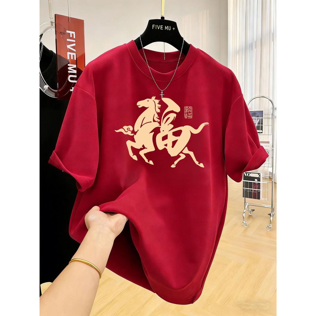 Celebrate the 2026 Year of the Horse with this vibrant red women's T-shirt. Crafted from soft, breathable cotton, this loose-fitting top offers comfort and style for any casual occasion. Featuring a unique printed design, it adds a festive touch to your wardrobe. The short sleeves and round neckline provide a classic, relaxed look perfect for everyday wear. Embrace the spirit of the year with this charming and comfortable T-shirt.
