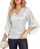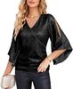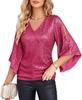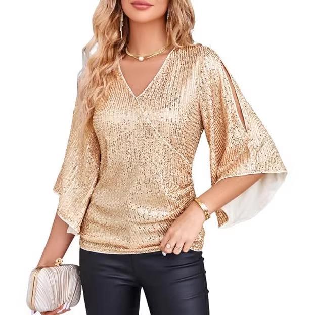 Elevate your vacation wardrobe with this stylish women's top, featuring a flattering V-neckline and elegant flare sleeves. Crafted from soft polyester, it offers a comfortable and lightweight fit perfect for casual outings. The top is adorned with shimmering sequins, adding a touch of glamour to your look. The half sleeves provide a breezy feel while maintaining chic sophistication, making it an ideal choice for any sunny getaway.