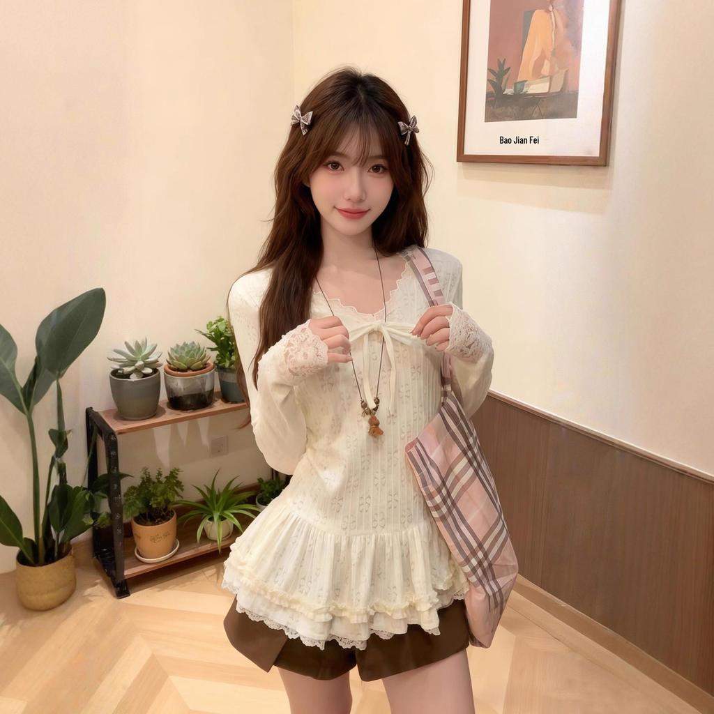 Korean Sweet Lace V-Neck Long-Sleeve Shirt for Women - Autumn/Winter Ballet Style Base Layer