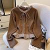 2025 Women's Plaid Patchwork Ruffle Knit Top with Lace-up Collar and Long Sleeves