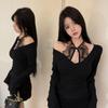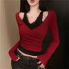 Chic Heavy-Duty Sequin Patchwork Lace Halter V-Neck Long-Sleeve Layered Fake Two-Piece Women's T-Shirt