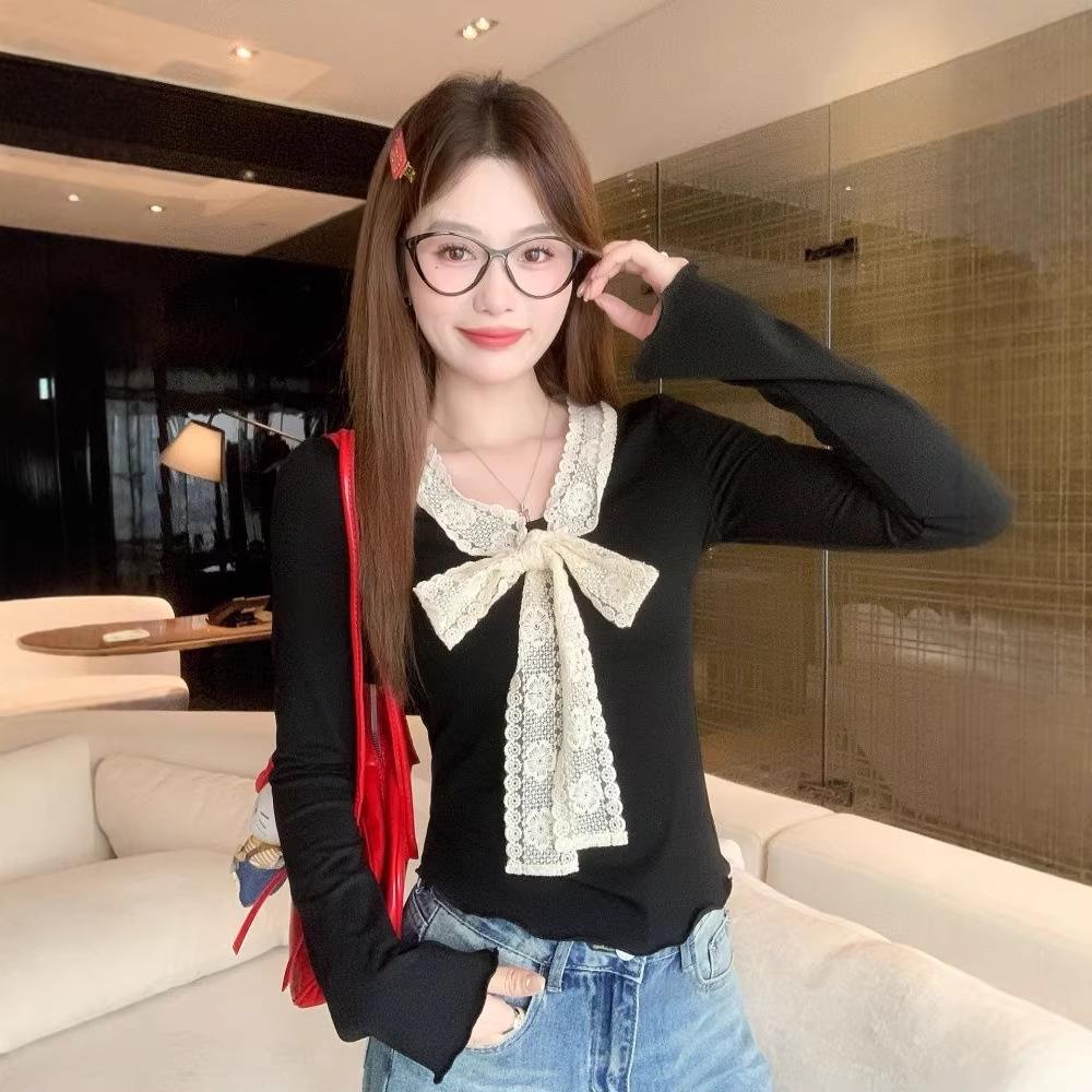 Women's Slim Fit Lace Bow Long Sleeve T-Shirt - New Autumn/Winter 2026 Chic