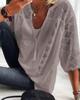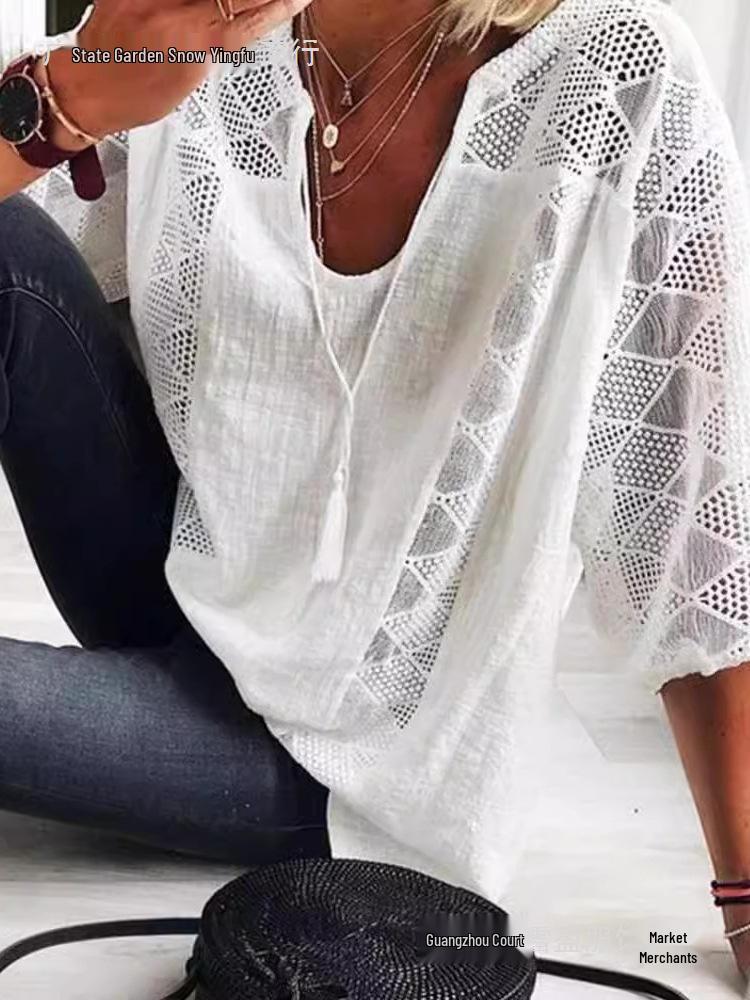 This stylish women's T-shirt blends European and American design elements, featuring a lace hollow design that adds a touch of elegance. Made from polyester, it offers comfort and durability. The U-neckline and 3/4 sleeves provide a flattering fit, making it a versatile addition to any wardrobe. The flat cloth material ensures a smooth and polished appearance, perfect for both casual and semi-formal occasions.