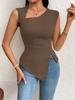 The Women's Elegant Asymmetrical Neck Slim Fit T-shirt is a chic and stylish addition to your spring and summer wardrobe. Crafted from high-quality polyester, this top offers a comfortable and lightweight fit, perfect for warm weather. Its asymmetrical neckline adds a touch of sophistication, while the slim fit accentuates your silhouette. With its solid pattern, this T-shirt is versatile and can be easily paired with various outfits. Designed without sleeves, it provides a modern and fresh look, ideal for any casual or dressy occasion.